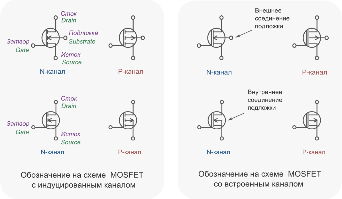 МОП‑транзисторы бывают двух видов — p-канальные и n-канальные.