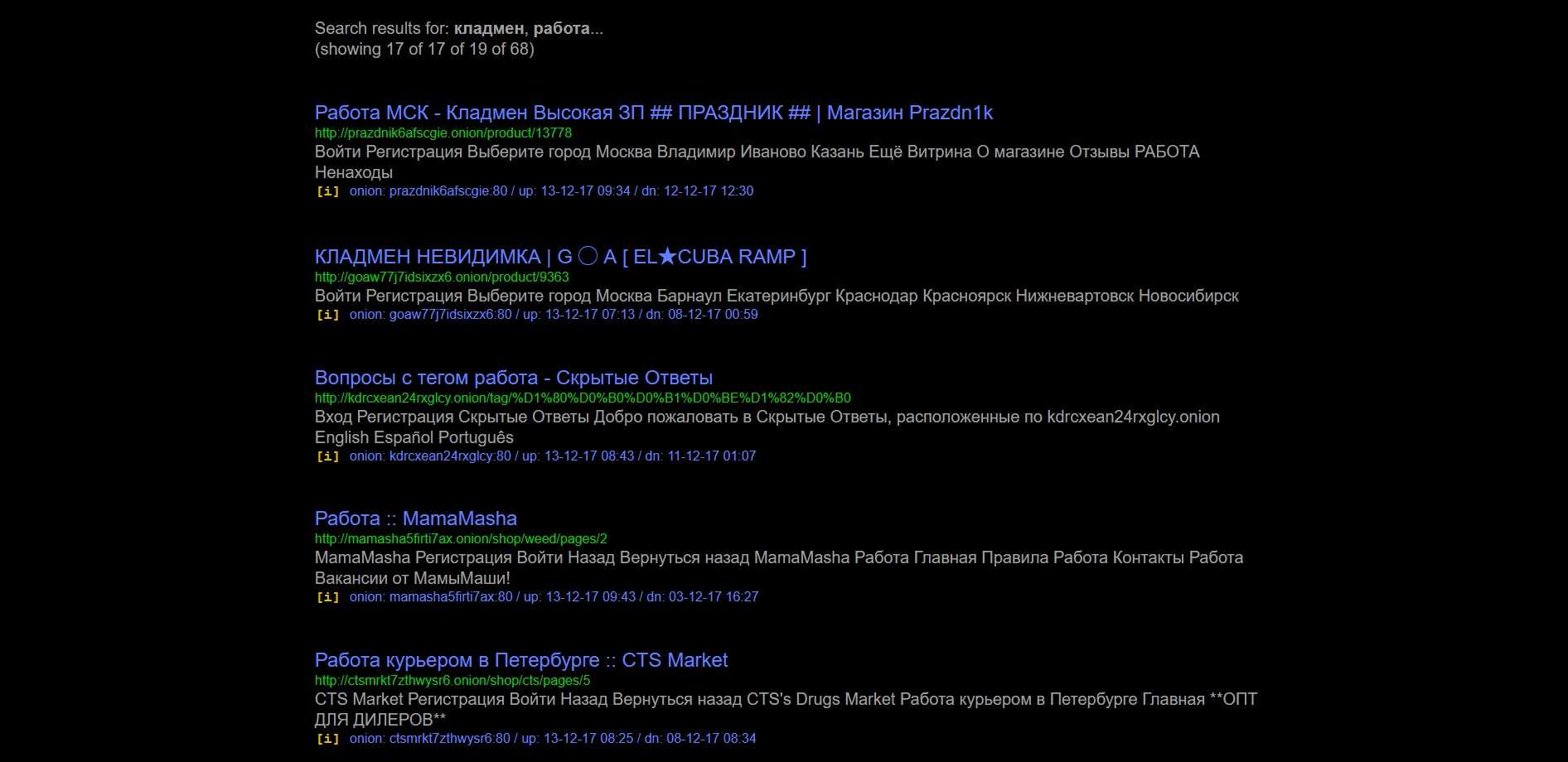 Результаты поиска зависят только от вас. Запросы на русском – не проблема, естественно. Вот, например, что предлагают для кладменов (людей, которые делают закладки с запрещёнными веществами в жилых районах):