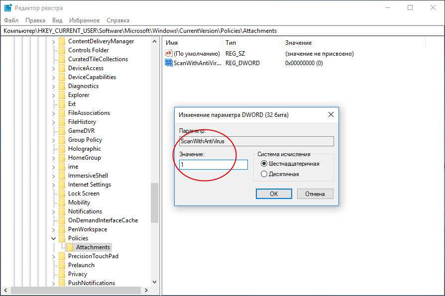 В качестве значения созданного параметра установите 1, это отключит проверку файлов Диспетчером вложений.