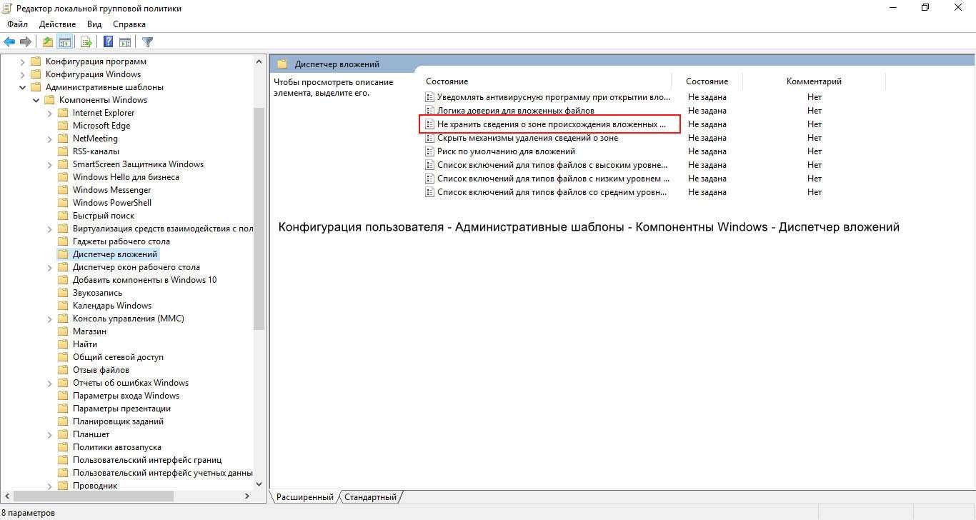 Справа откройте и включите политику «Не хранить сведения о зоне происхождения вложенных файлов».