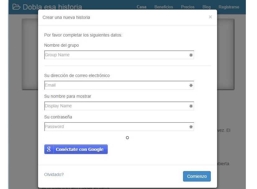 После этого появится окно с формой подписки, где мы можем использовать наши личные данные (в основном имя и адрес электронной почты) или также связать это приложение с нашей учетной записью Google+, последняя является одной из наиболее подходящих, поскольку с этим мы избежим заполнить каждое из полей указанной формы, хотя, первое поле является обязательным, так как там вы должны указать название группы, которую вы создадите.