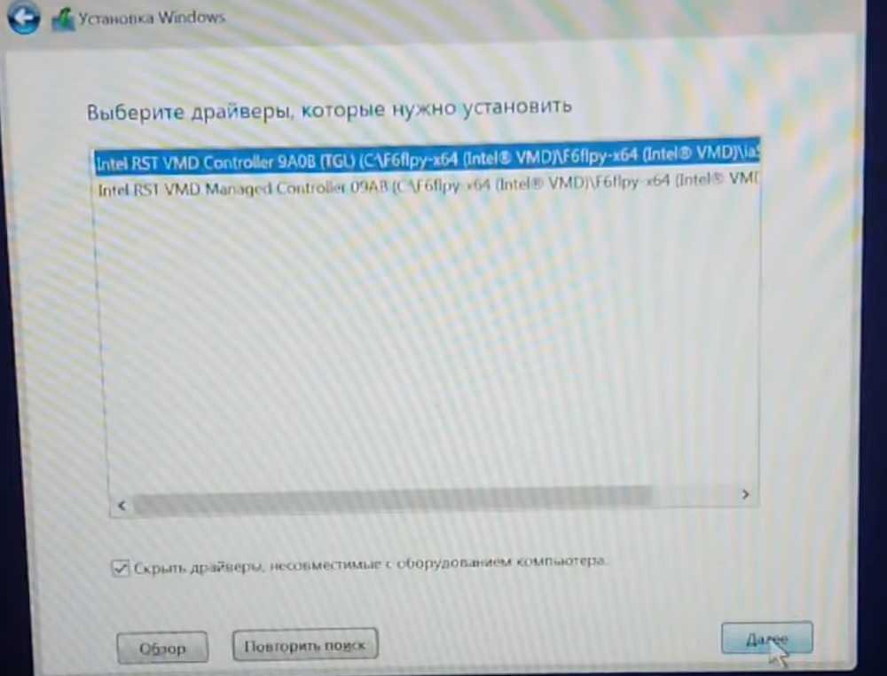 Появится выбор драйвера. Выбираем первый – Intel RST VMD Controller 9A0B и нажимаем “Далее”.