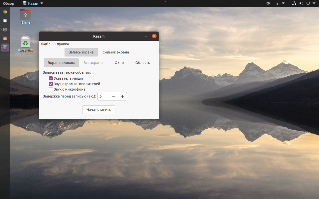 Если вам не хочется заморачиваться с настройками, то Kazam подойдёт как нельзя лучше. Присутствует самый минимум настроек, но даже этого многим достаточно для записи видео с экрана. В качестве контейнера выбран mp4, видео записывается кодеком h.264, а звук в mp3.