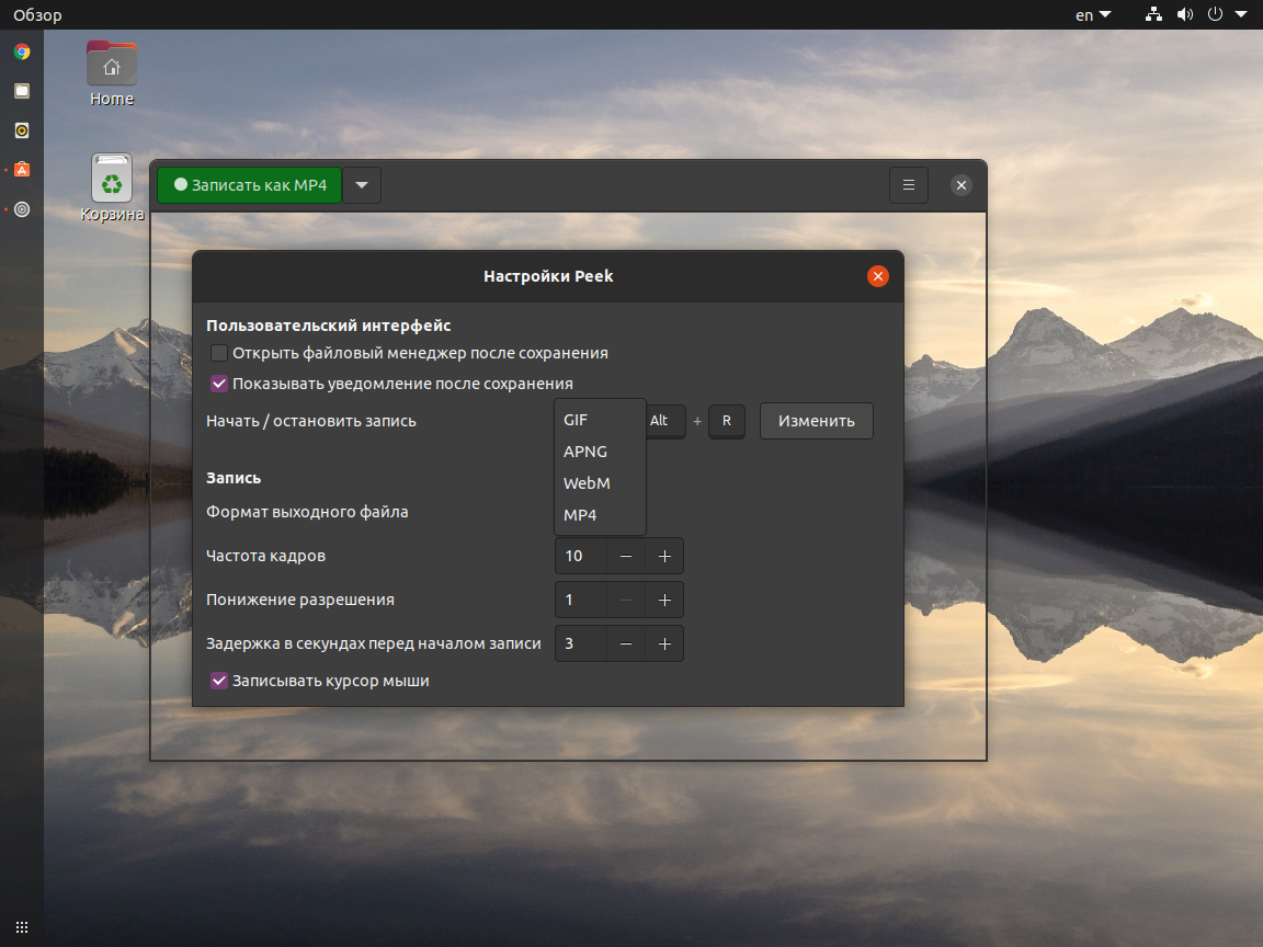Запись видео с экрана Linux выполняется в формате mp4 или webm с кодеком h.264 или vp9 соответственно. Если звук не важен, то смело используйте Peek и для захвата видео с экрана.