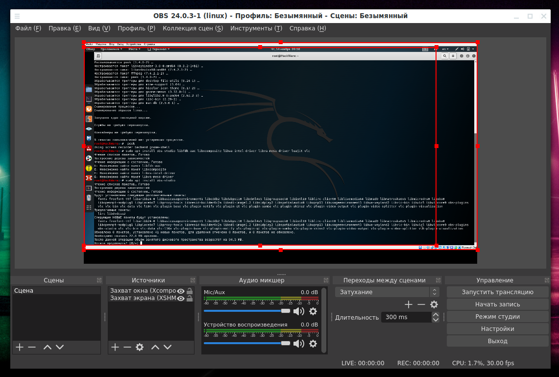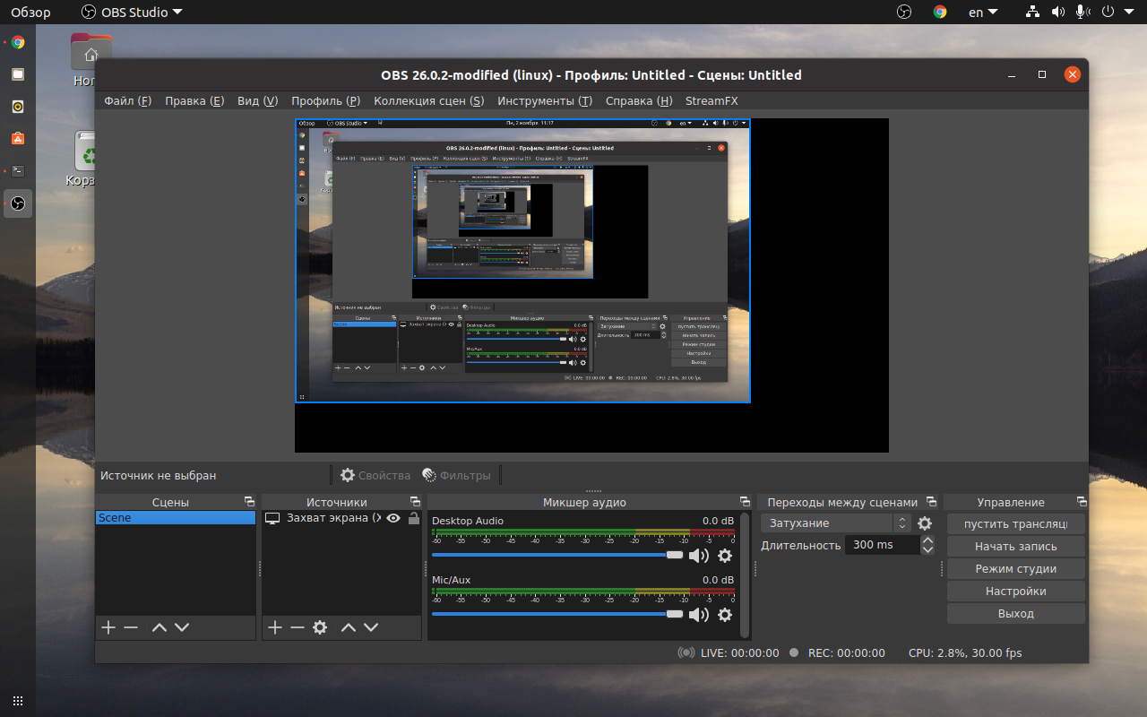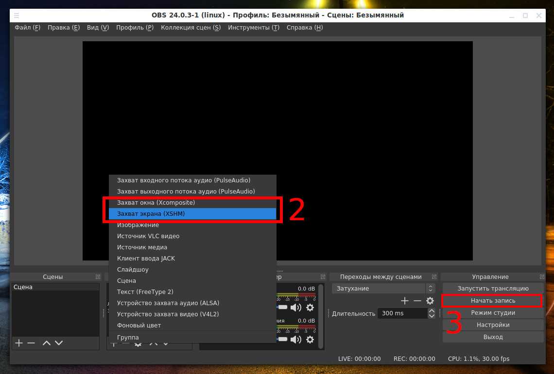 Наиболее функциональным решением, позволяющим выполнить захват видео с экрана Linux является OBS Studio. Эта программа знакома многим пользователям не только Linux, но Windows с macOS. Она позволяет записывать видео с нескольких источников, в том числе с наложением картинки. Также возможна трансляция на все популярные платформы: YouTube, Twitch и другие.