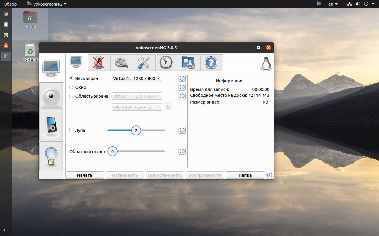 Есть проблема, что звук записывается только с микрофона, то есть, если вы записываете игру, то звука из игры на видео не будет.На официальном сайте есть статья по этому поводу:Я, думаю, что вы заметили в видео, которое я показал вначале, что там звук из игры есть.Из этой статьи я воспользовался самым простым вариантом.Во-первых, на первом окне настроек выбираем Pulse Audio для захвата звука.Открываем терминал и выполняем следующую команду: