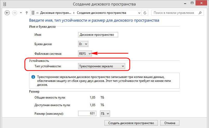 Трёхстороннее зеркало – это аналог RAID 1E, массив из как минимум пяти носителей, обеспечивающий быстродействие и высокую отказоустойчивость. Защищает данные в случае выхода из строя сразу двух дисков. Файловая система – и NTFS, и ReFS.