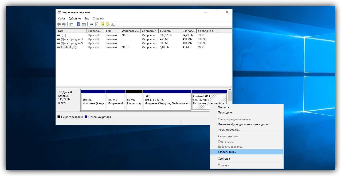 Запустив утилиту, щёлкните правой кнопкой мыши по диску, который вы собираетесь стереть (например, условный диск D), и выберите «Удалить том». С системным томом, на который , такого проделать нельзя, так как процедура уничтожает все хранящиеся в разделе файлы.