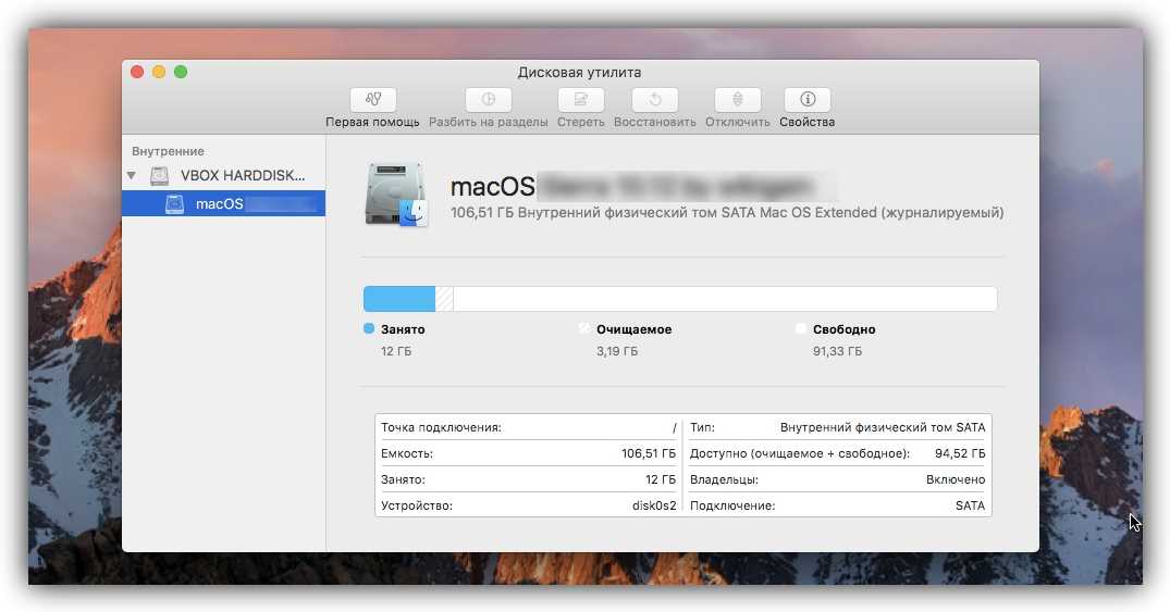 Запустив «Дисковую утилиту», на левой панели выберите жёсткий диск, разделы которого вы хотите отредактировать, и кликните по кнопке «Разбить на разделы».