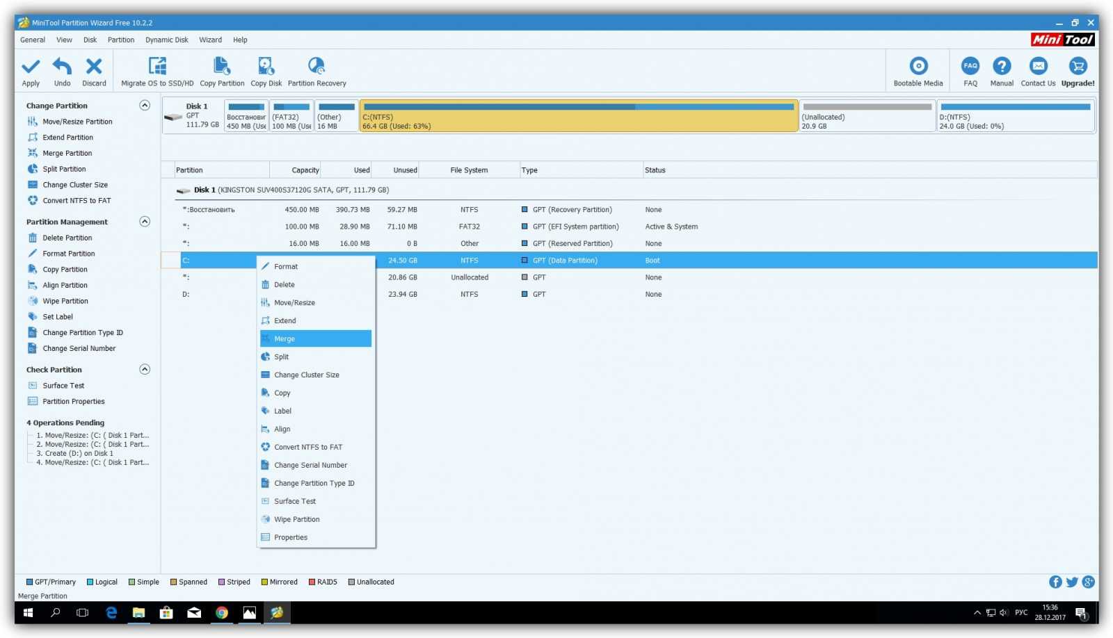 Итак, чтобы объединить диски с помощью MiniTool Partition Wizard, запустите программу и кликните по тому (пусть будет C), к которому вы хотите присоединить другой раздел (условный D). В контекстном меню выберите вариант Merge («Объединить»).