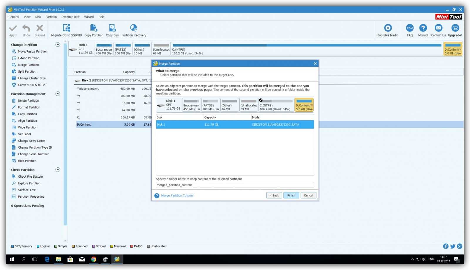 Теперь кликните по разделу (D), который собираетесь присоединить к уже выбранному. В нижней половине окна появится поле с названием папки: merged_partition_content. Программа создаст её на целевом разделе и скопирует туда все файлы с удалённого. Если хотите, переименуйте эту папку. Нажмите Finish.