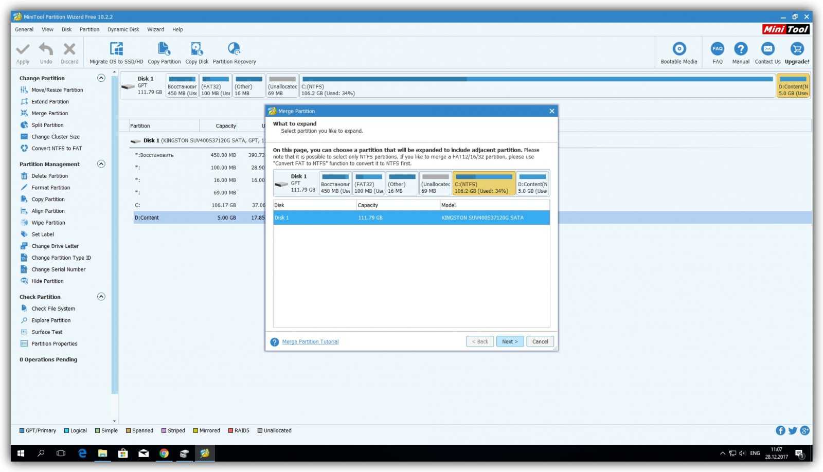 Важно! Для объединения требуется удаление второго раздела. Поэтому перед выполнением процедуры необходимо перенести все файлы на раздел, к которому будет применено свободное пространство, или на внешний носитель