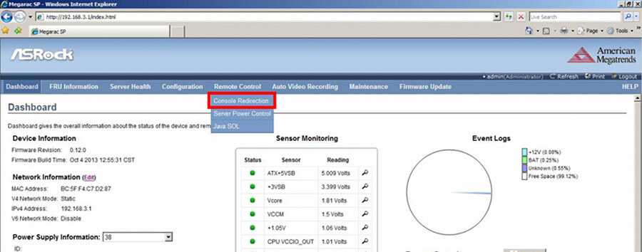 Залогинившись через веб браузер переходим в пункт меню Remote Control-Console redirection