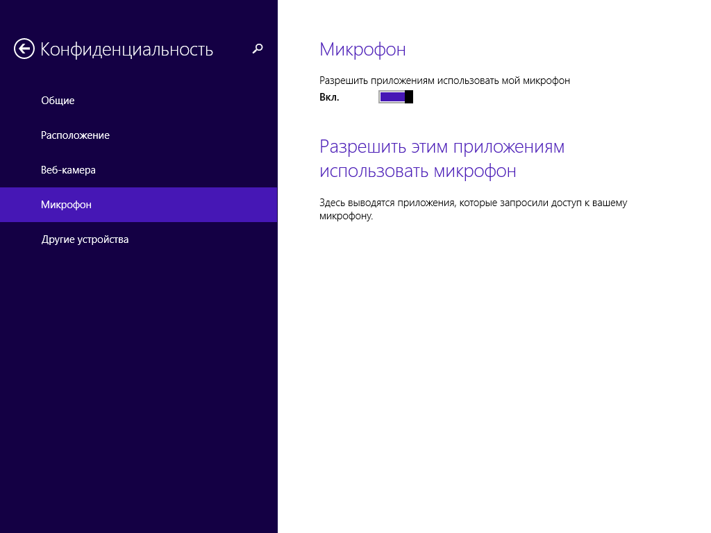 5. Перейдите к пункту «Микрофон» и удостоверьтесь, что в пункте «Разрешить приложениям использовать мой микрофон» переключатель стоит в положении «Вкл.», как на скриншоте: