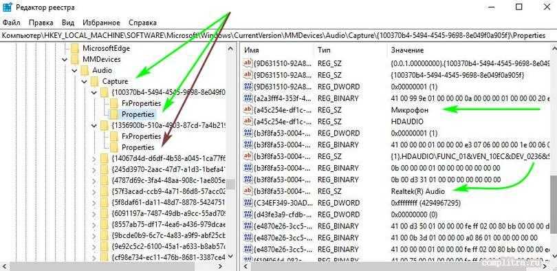 В этой папке придётся немного поработать: поочередно открываем подпапки с цифровым кодом {987…: наша цель в каждой подпапке в разделе «Properties» отыскать окно, в значении которого будет указан «Микрофон» — вот именно эта папка и потребуется для отключения микрофона на ноутбуке с ОС Windows 10.