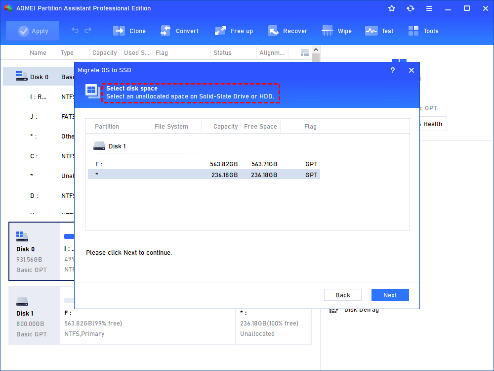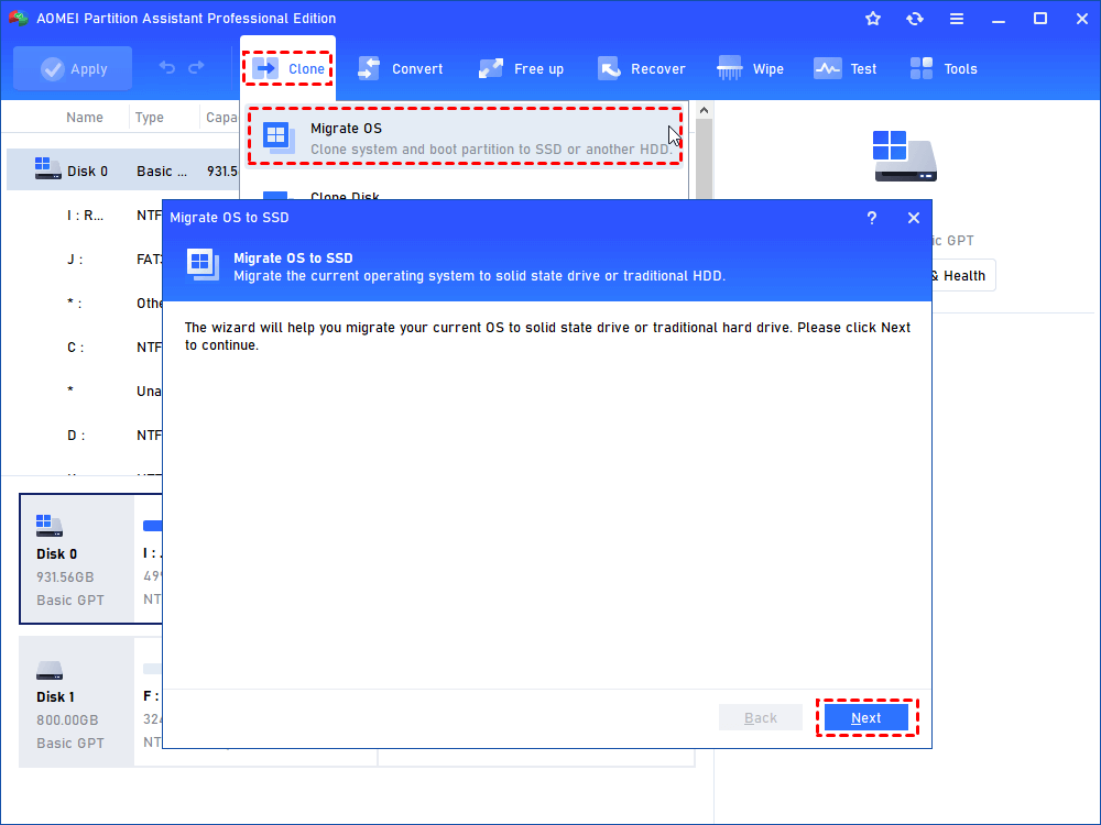 Migrate OS to SSD function in AOMEI Partition Assistant Professional can help you to copy only Windows OS related partitions. Here are the detailed steps