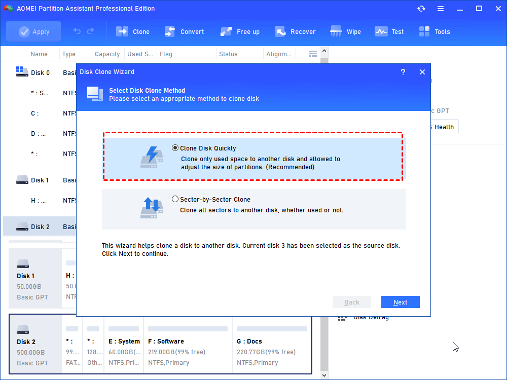 Step 3. Choose a way to clone Windows 8/8.1 hard drive to SSD and click Next. Here I choose Clone Disk Quickly as I need to clone to a smaller disk.