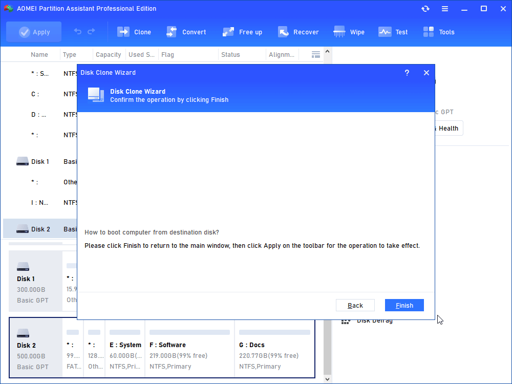 Step 4. A note about how to boot from the target disk shows up. Click Finish after you remember it.