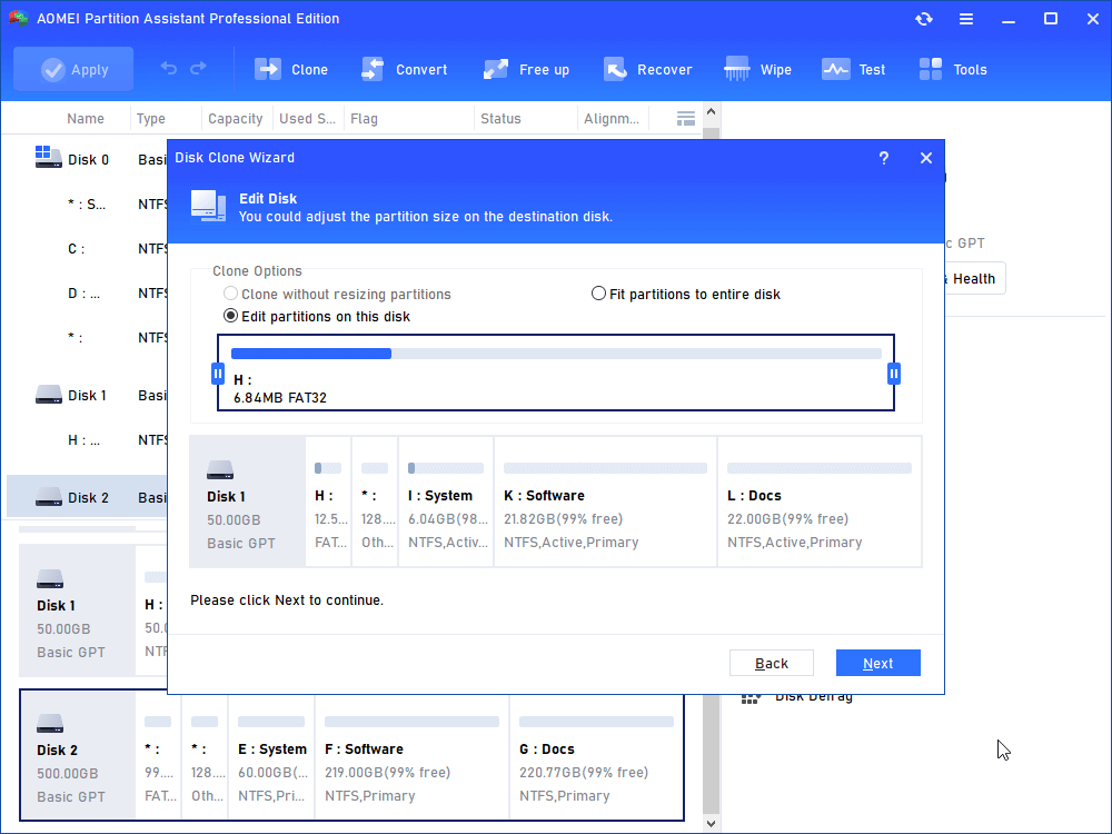 Tips:◐ Edit Partitions: you can choose to resize partitions on the destination disk or not here.◐ SSD Alignment: it will improve the reading and writing speed of the SSD. Use this option if the destination disk is an SSD.◐ Sector by sector clone: it will clone every sector on the source disk whether it is used or not, thus costing more time. It requires the destination disk to be equal to or larger than the source disk.