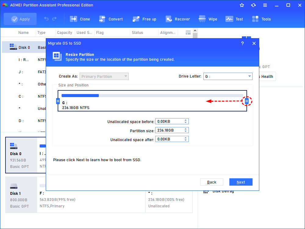 Step 3. You can adjust the size, drive letter, etc. of the partition on the target disk.