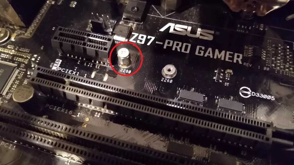 Для начала извлеките винт рядом со слотом M.2. Если у накопителя есть какие-либо крепления, нужно привинтить их сейчас. В результате во время прикручивания накопитель будет располагаться параллельно материнской плате, а не под углом.