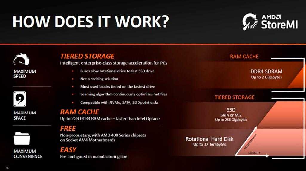 AMD StoreMI — это программа, разработанная компанией AMD, которая предоставляет возможность объединения быстрой системной SSD и большой вместительной HDD в единую виртуальную единицу хранения. Такая комбинация позволяет достичь высокой производительности, так как данные, наиболее часто используемые системой, будут автоматически перемещаться на SSD.