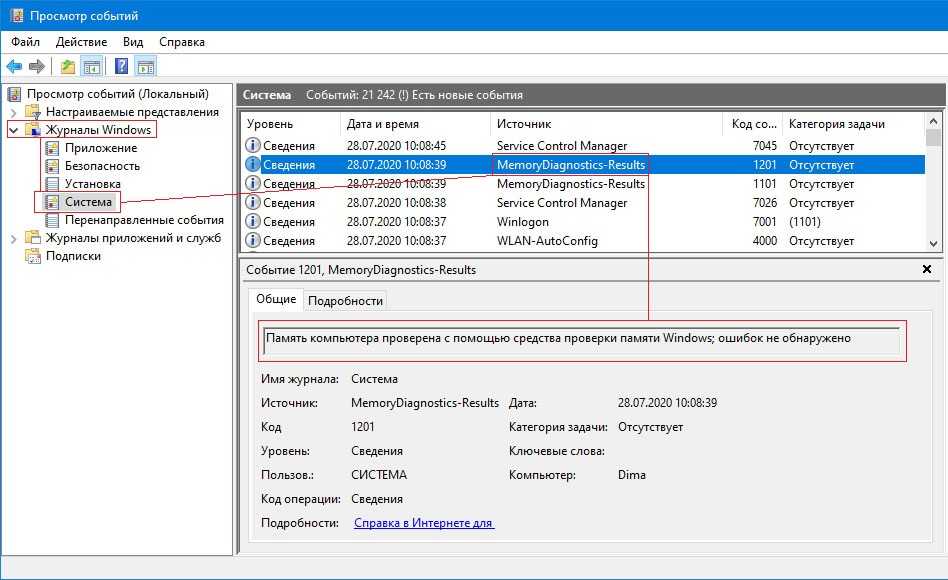В области «Система» кликните по «MemoryDiagnostics-Results». Ниже отобразится информация о событии. Эту информацию можно получить из области «Действия», в правом нижнем углу окна «Просмотр событий».