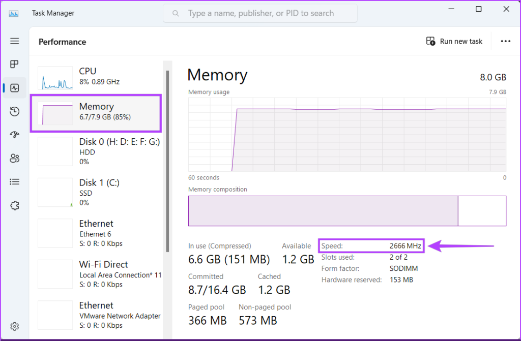 Шаг 3: На вкладке «Производительность» щелкните раздел «Память» на левой панели. На правой панели будут отображаться такие сведения, как используемые слоты, форм-фактор и скорость оперативной памяти