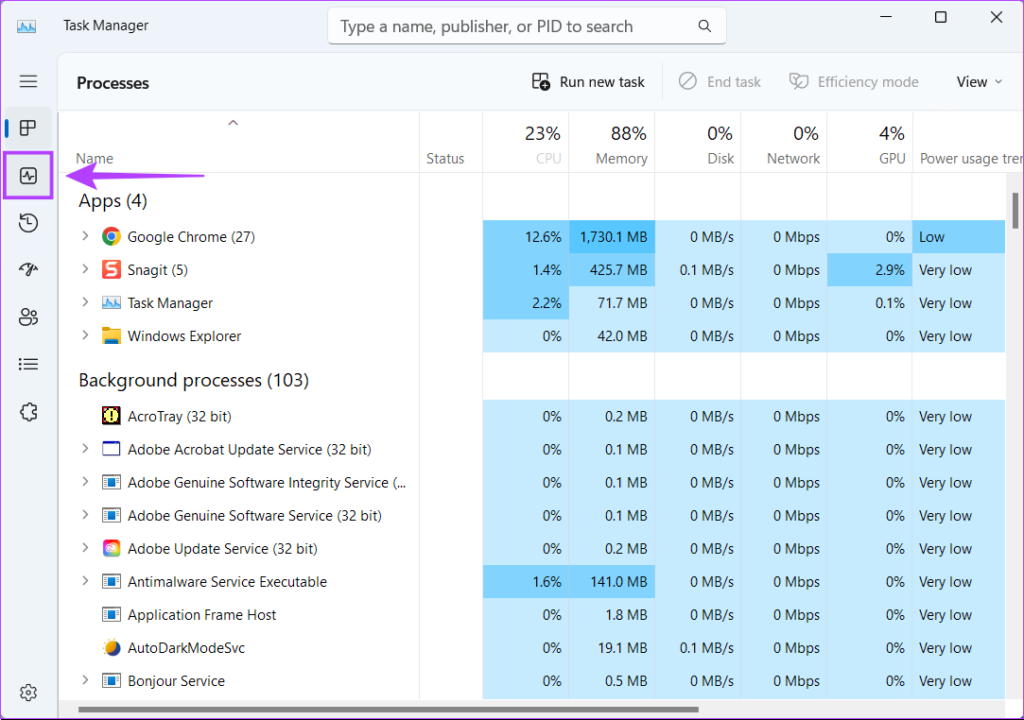 Шаг 2: В диспетчере задач щелкните вкладку «Производительность» на левой боковой панели.