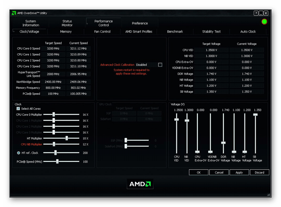 Осуществляется это через отдельную вкладку, где путем перемещения ползунков и ручной установки значений выполняется установка оптимальных параметров. Все изменения тут же вступят в действие, поэтому можно сразу же приступать к проверке быстродействия и стабильности работы системы. Учитывайте, что при работе с AMD OverDrive после перезагрузки компьютера все настройки будут сразу же сброшены и их придется устанавливать повторно. С одной стороны это является недостатком, а с другой поможет предотвратить проблемы, которые связаны с неправильной конфигурацией.