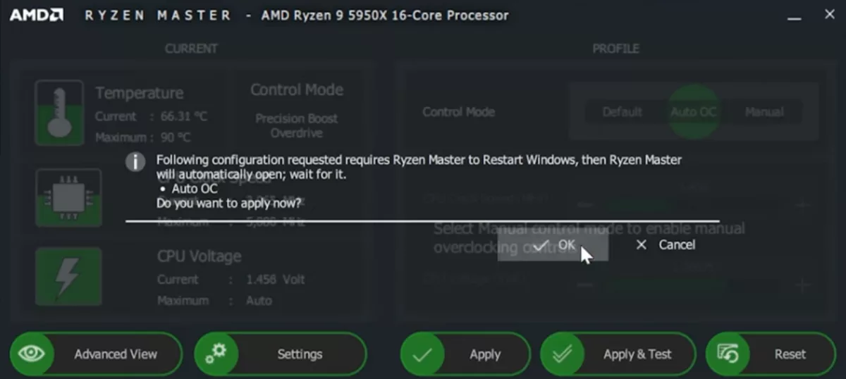 - Измените значения параметров в программе AMD Ryzen Master согласно выбранным оптимальным значениям. После каждого изменения значения нажмите кнопку «Apply» для применения изменений.