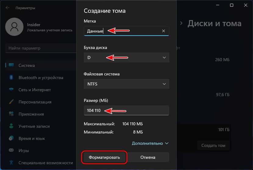В графе «Размер (Мб)» нужно указать размер создаваемого раздела. Мы либо оставляем всё свободное место, либо указываем в Мб только часть, чтобы остальную часть потом распределить между другими разделами. Жмём «Форматировать».