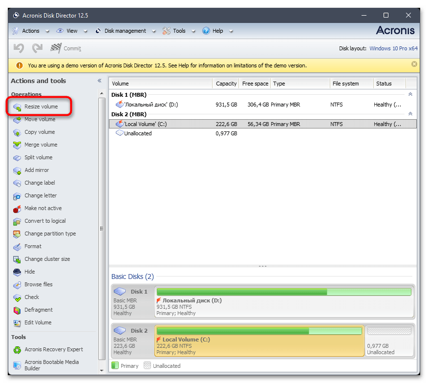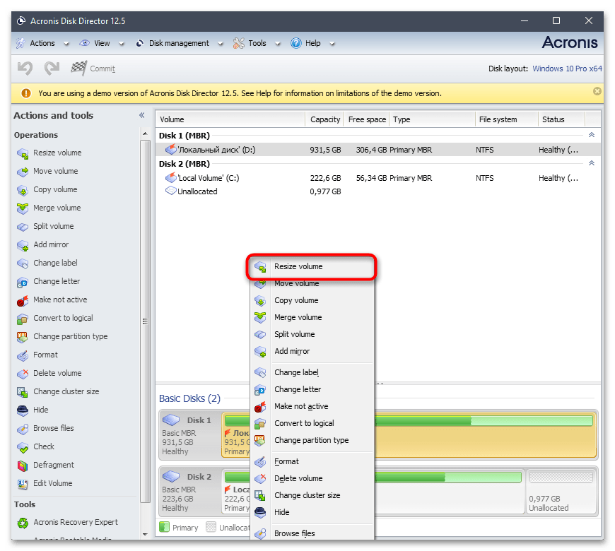 Выделите левой кнопкой мыши диск C и слева выберите «Resize volume». Вместо этого еще можно кликнуть по диску правой кнопкой мыши и найти то же самое действие.