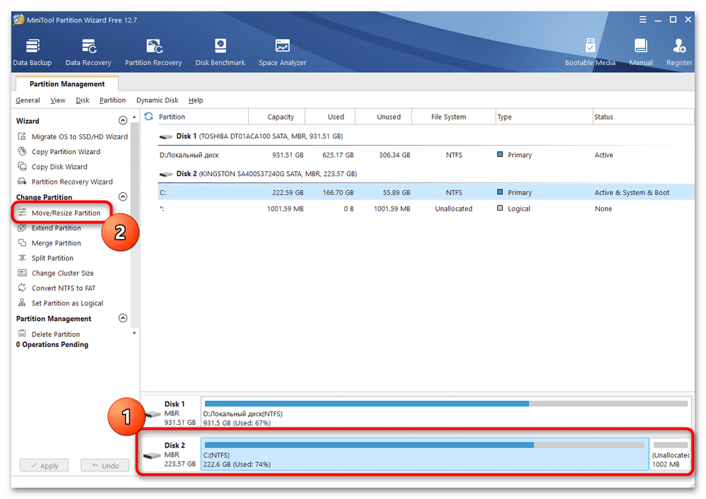 Теперь выделите диск C для расширения и активируйте то же самое действие под названием «Move/Resize Partition».