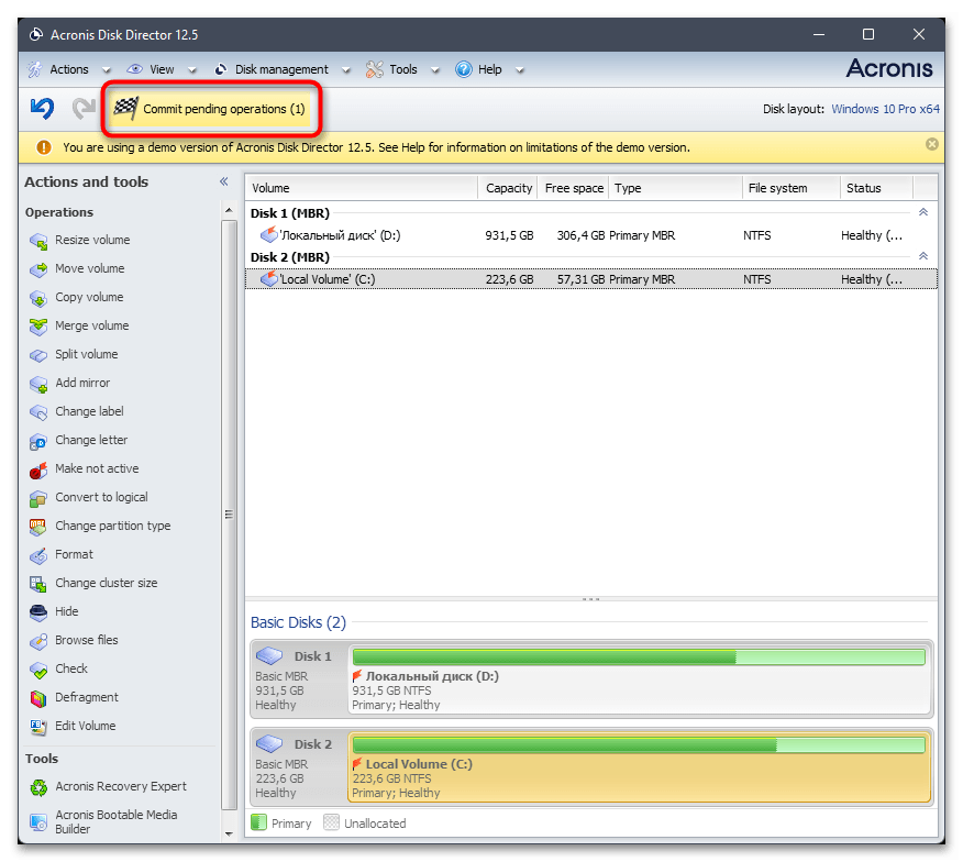 В подобных программах все действия, которые вы выполняете, являются исключительно подготовительными, а в силу они вступают после подтверждения. Для этого щелкните по «Commit pending operations». Дождитесь уведомления об успешном завершении перераспределения пространства и переходите к работе с операционной системой.