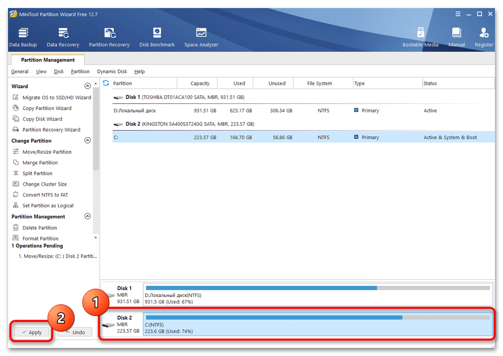 Остается только убедиться в том, что диск успешно расширен, и применить изменения, кликнув по «Apply».
