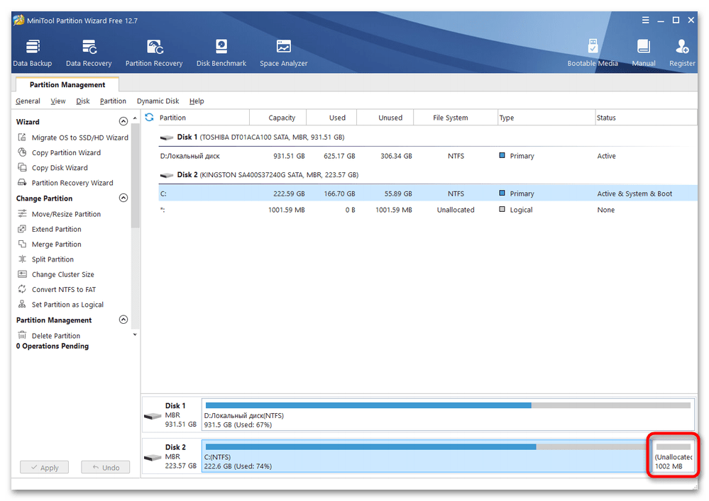 После применения изменений вернитесь к главному окну программы и проверьте, появилось ли теперь нераспределенное место, которое можно было бы использовать в дальнейшем.