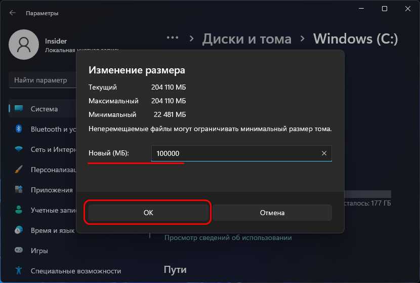 Передвиньте ползунок вправо немного или полностью, если хотите назначить диску C все свободное пространство. Подтвердите настройку нажатием по «ОК».