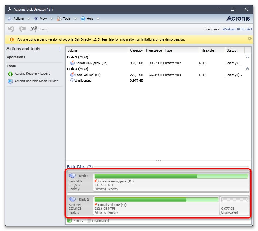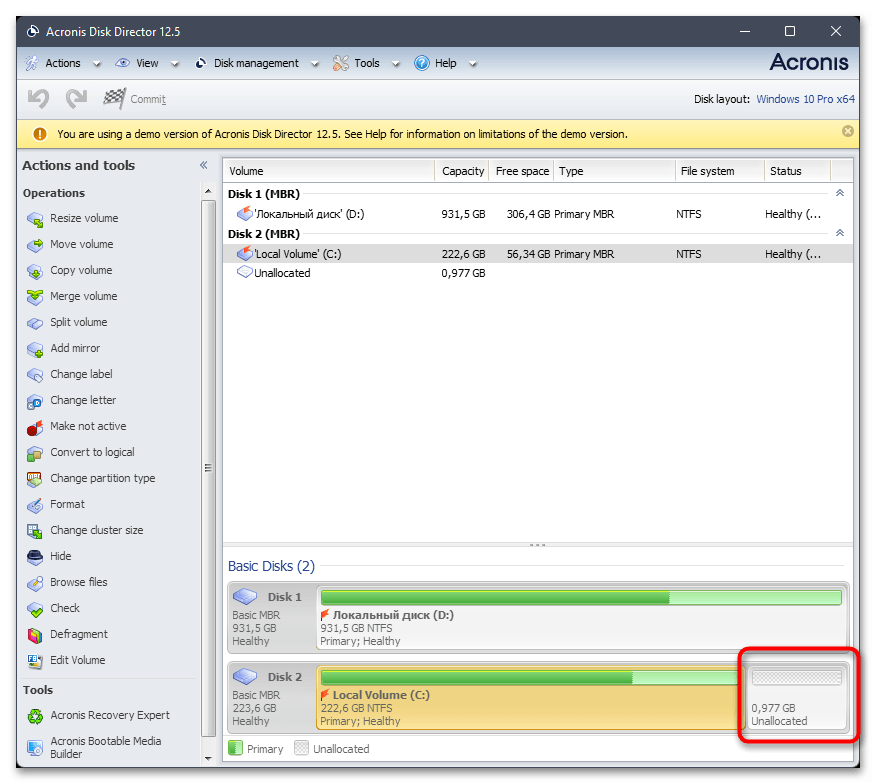 В Виндовс 11 есть только одно системное средство, при помощи которого можно было бы расширить пространство логического тома жесткого диска, как это было показано выше. Если оно по каким-то причинам вам не подходит, понадобится обратиться к специализированным программам. Первая такая называется Acronis Disk Director, и у нее есть бесплатная версия, предназначенная для ознакомления с функциональностью.