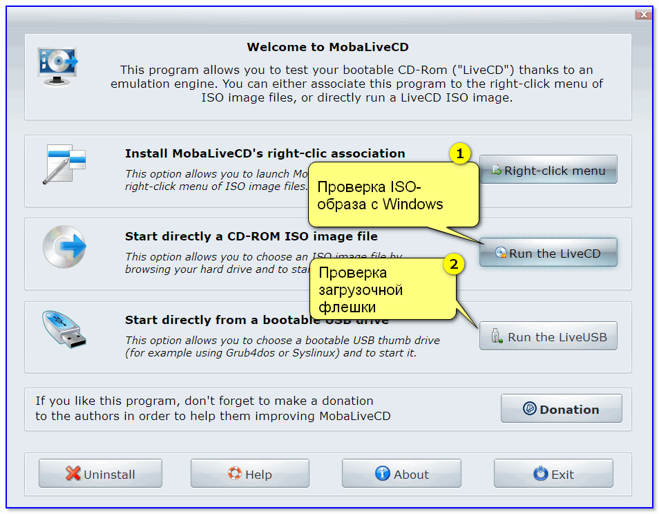 - если вам нужно проверить ISO образ с Windows — кликните по кнопке «Run the LiveCD» ;
