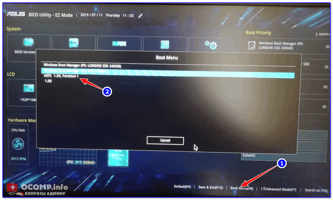Во-вторых, попробуйте войти в загрузочное меню (при включении ПК ноутбука) и посмотрите, видит ли ваша система флешку (если у вас UEFI — напротив вашей флешки будет гореть «UEFI:», см. скрин ниже) . Это быстрый и надежный способ узнать тип флешки.
