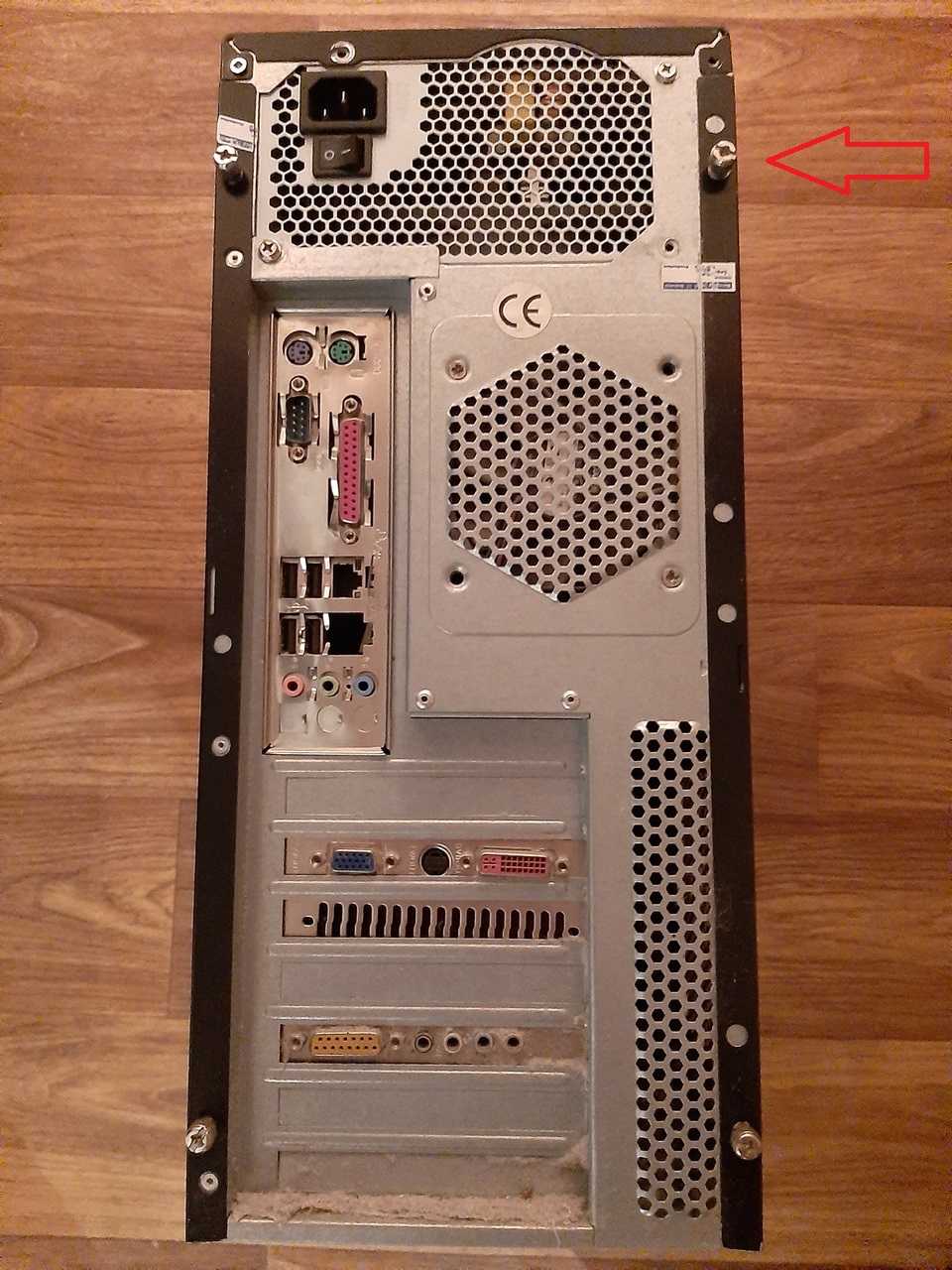 Перед тем как приступить необходимо полностью отключить процессор от источника питания. У каждого системного блока сбоку есть съемная крышка, откручиваем на задний панели два винтика и снимаем крышку.