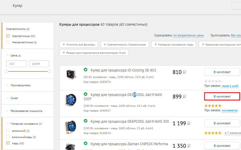 Дальше выбираем кулер для процессора: снова ставим метку «Совместимые» и отмечаем другие нужные свойства.