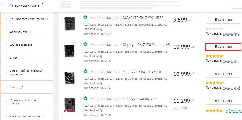 - Приступайте к выбору следующих деталей точно так же, как это было и с процессором.
