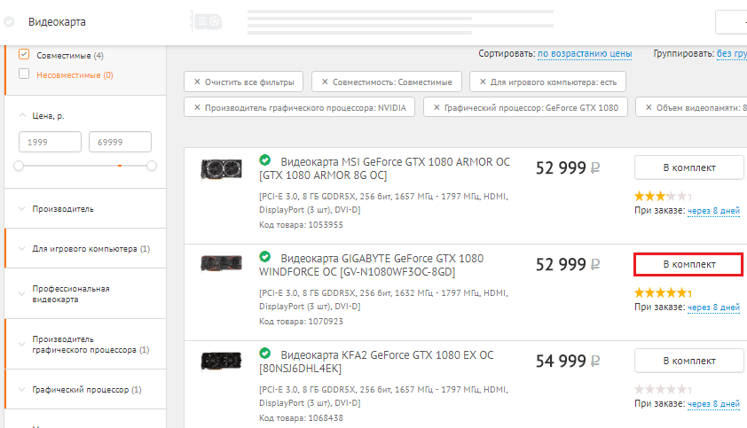 Наш выбор пал на GIGABYTE GeForce GTX 1080 WINDFORCE OC. Добавляем ее в комплект и переходим к подбору материнской платы.