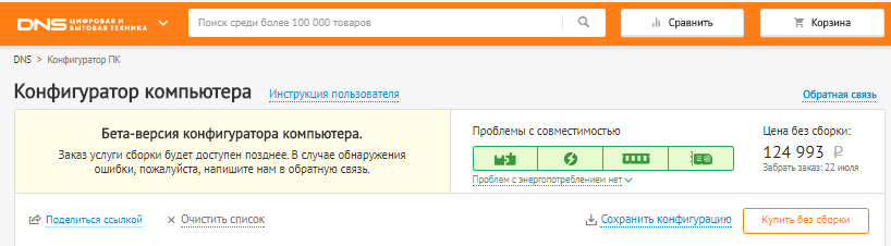 Вы можете сохранить свою сборку в личном кабинете на сайте DNS (потребуется регистрация) и там же, если хотите, оформить покупку. Но делать это сразу мы вам не советуем, так как подобные сервисы-конфигураторы есть и в других магазинах, где цены могут быть ниже, ассортимент — богаче, а сроки поставки — короче. Давайте с ними познакомимся.