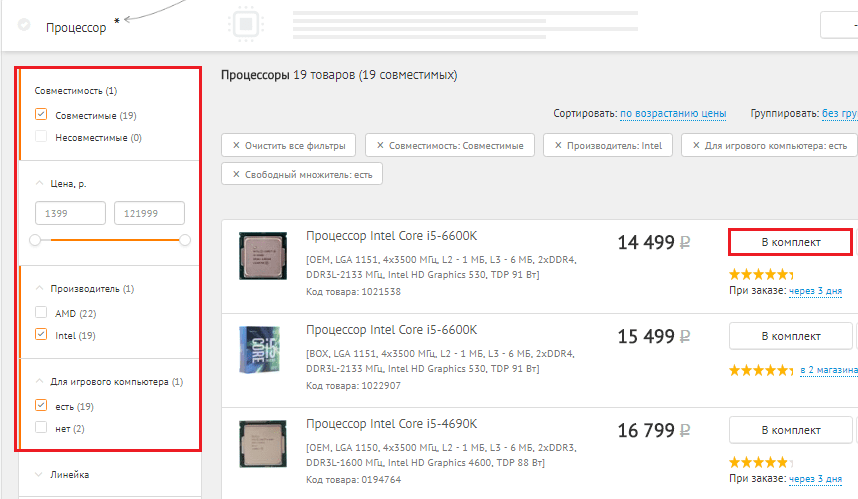 В левой колонке следующей страницы собраны характеристики ЦП, в правой — перечислены товары из ассортимента магазина. Мы подбираем процессор марки Intel со свободным множителем (для возможности разгона). После того как мы отметили интересующие параметры, сервис автоматически нашел подходящие модели. Выбрав одну из них — Intel Core i5-6600K без кулера, нажимаем «В комплект».