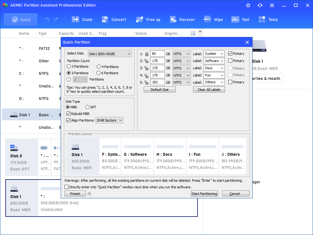 To avoid all troubles you might meet when you use CMD, AOMEI Partition Assistant Professional is a great alternative tool. The function “Quick Partition” can automatically set all partitions in the correct way, With only a few clicks, you can quickly create a bootable GPT disk for installing OS.
