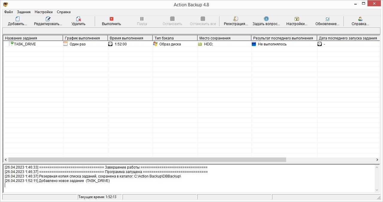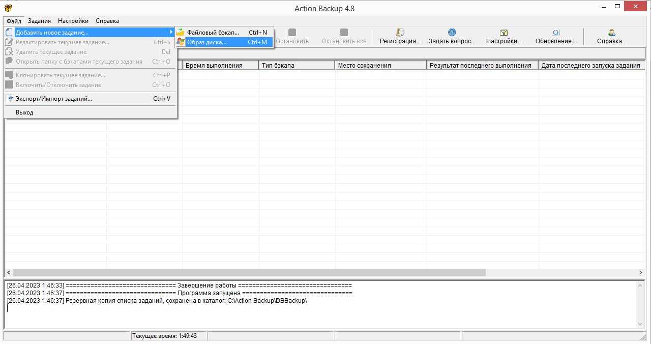 Action Backup создаст соответствующее задание резервного копирования, которое в соответствии с заданным расписанием, выполнит создание образа диска.
