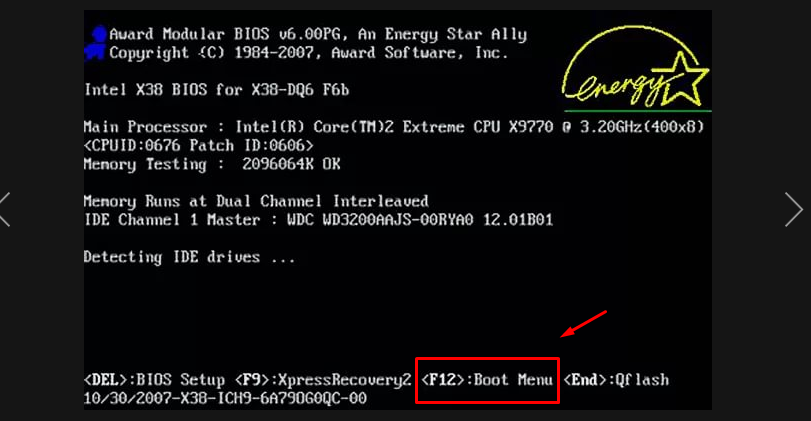 Как только увидите такое окошко — нажмите F12, вы попадете в меню выбора устройства, с которого Вам нужно загружаться: